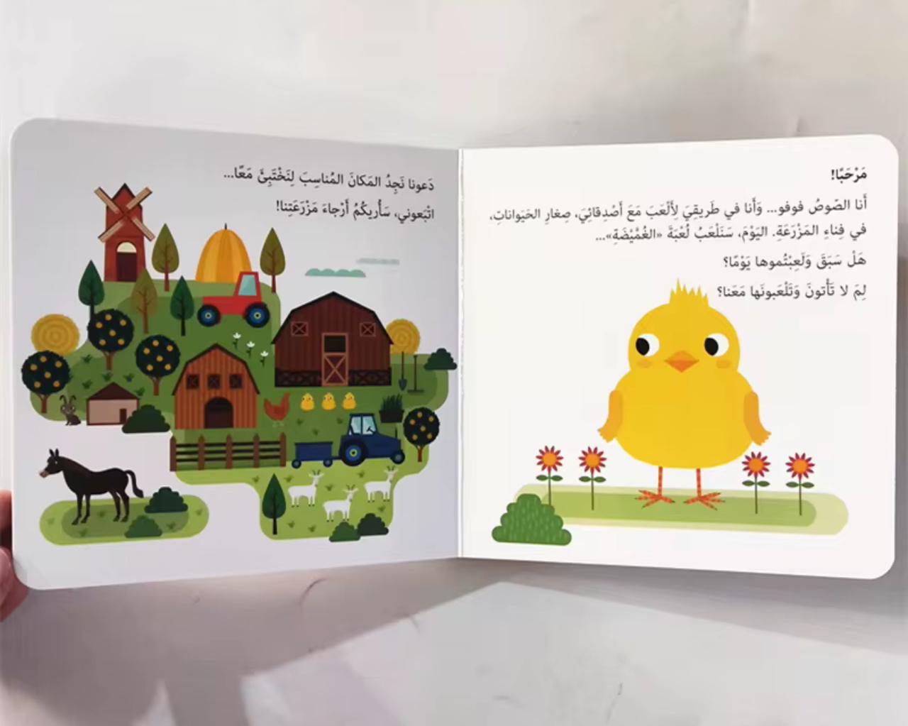 Interactive Arabic board book designed to introduce children to their first words through engaging visuals and simple sentences.